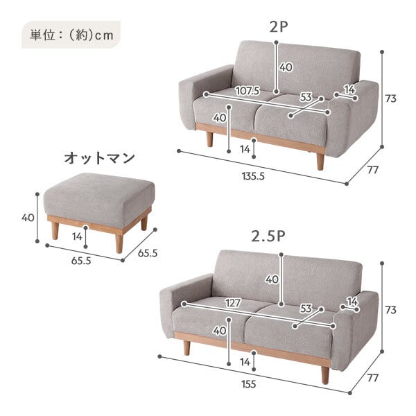 2.5人掛け:幅155×奥行77×高さ73cm(座面高:40cm)
