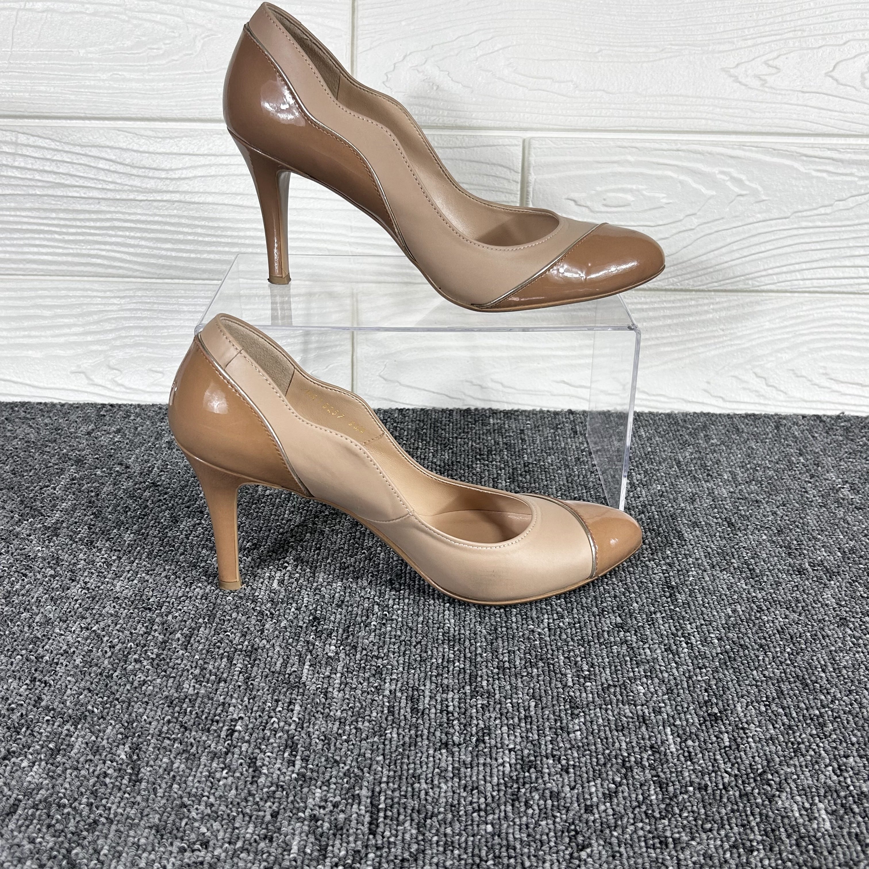 ベージュ×キャメルのバイカラーが足元を美しく整え、