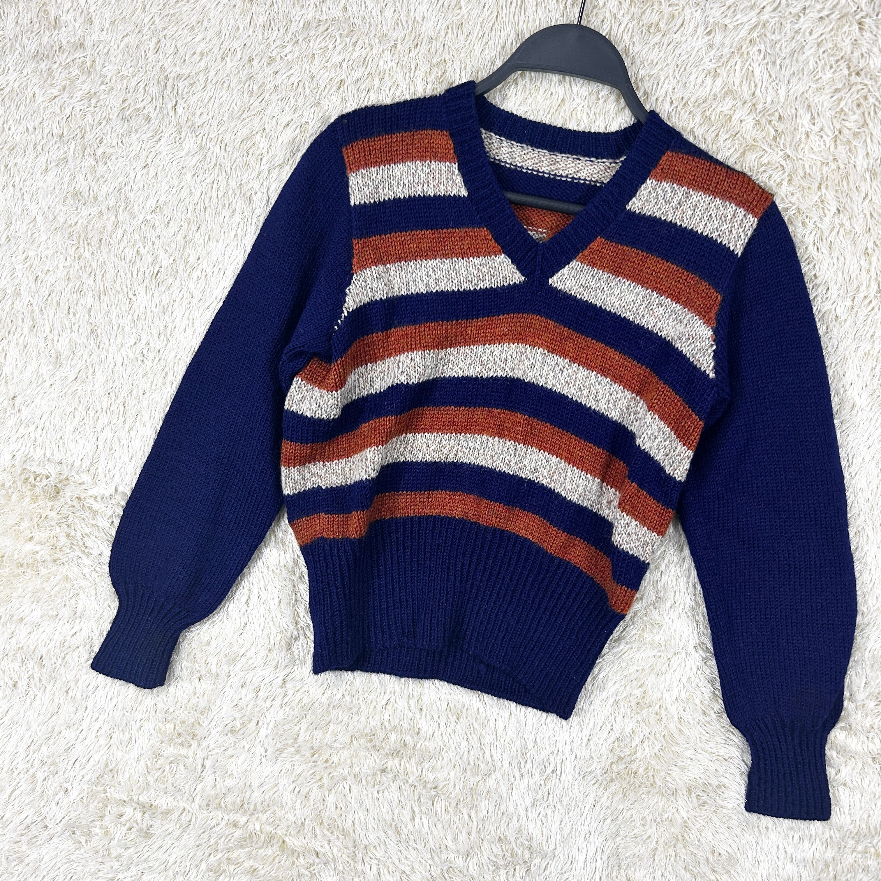 レトロ配色ボーダー Vネックニット セーター ネイビー