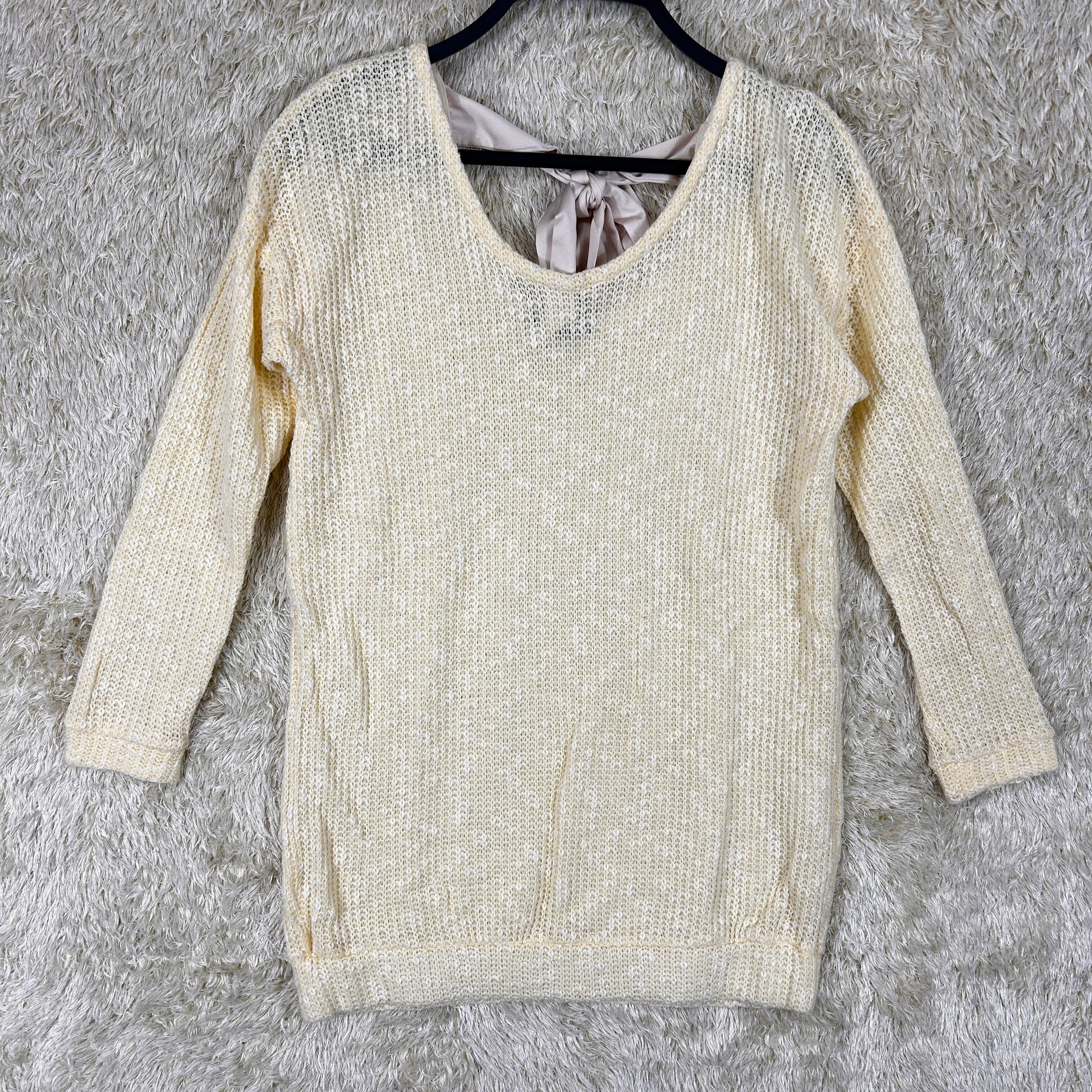 ざっくり編まれた柔らかなアイボリーニットに、背面のリボンがさりげないアクセントを添える一枚です。