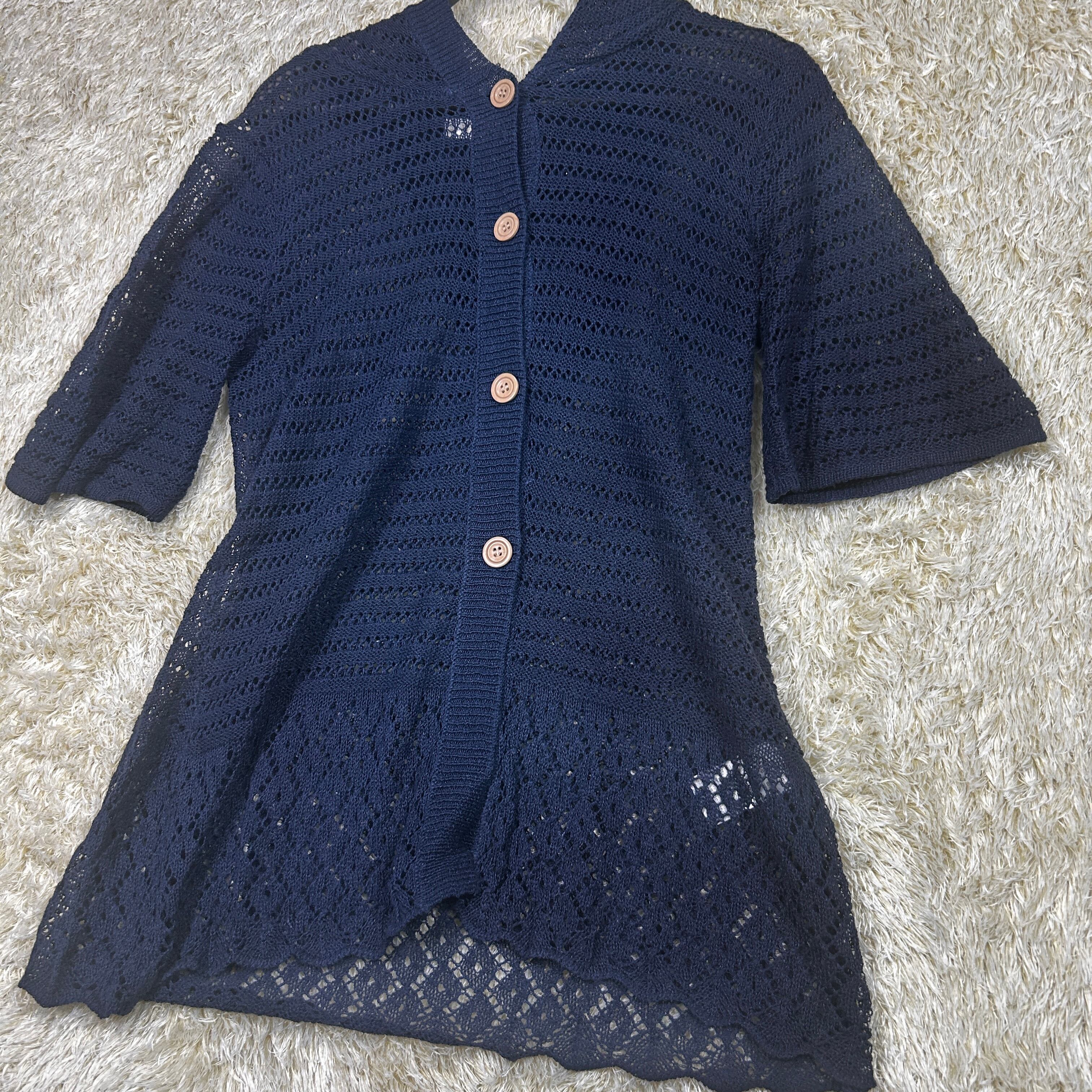 Red Wisp 透かし編み フード付き 半袖ニットカーディガン ネイビー M相当 レディース