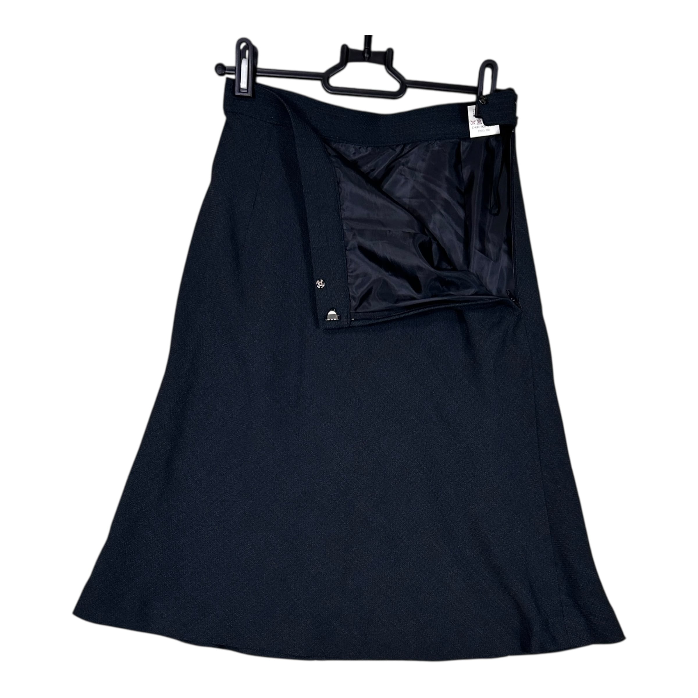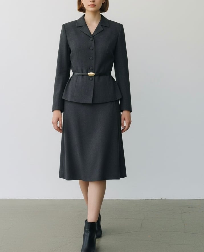 スカートは落ち着いた丈感で、座ったときや歩行時も安心感のあるデザイン。