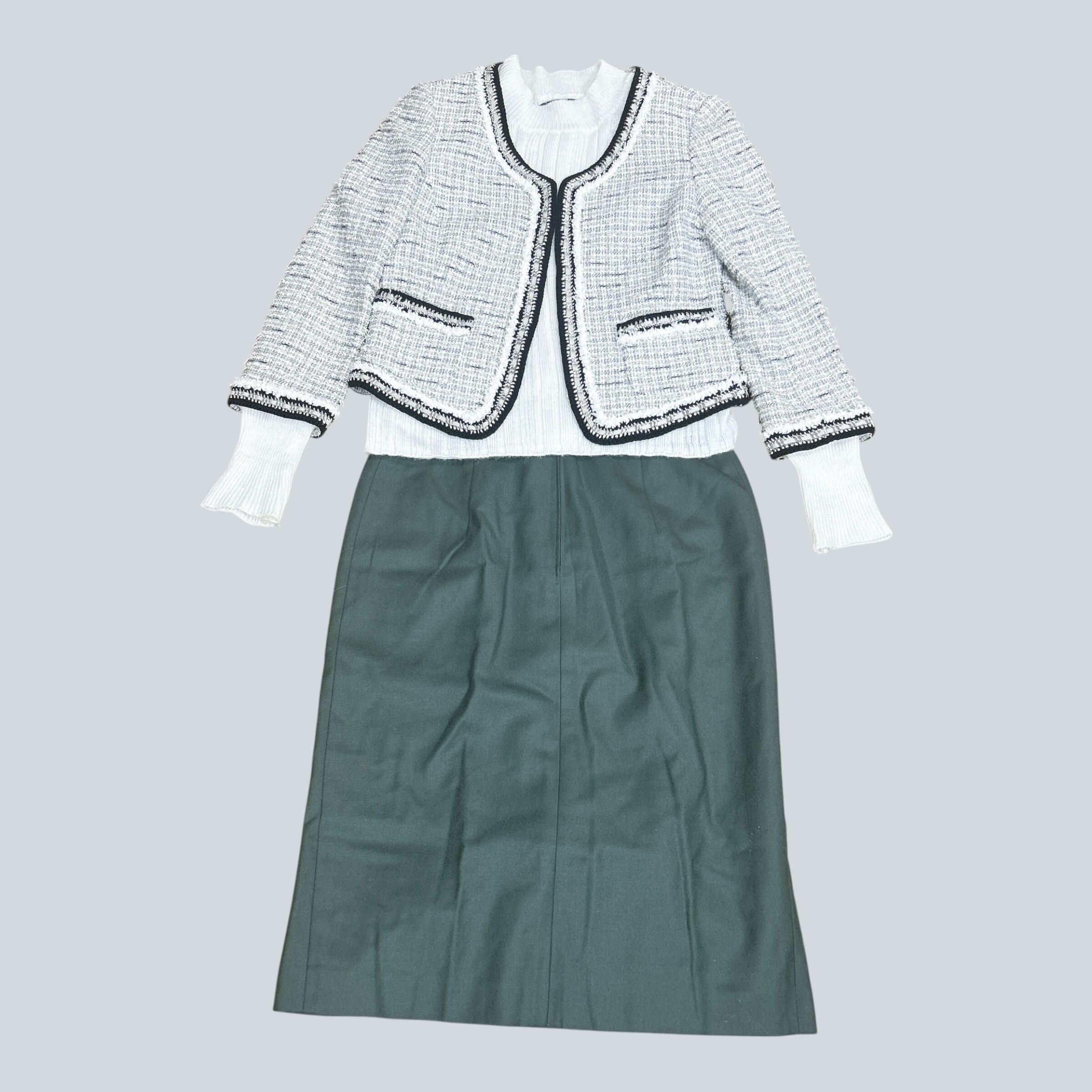 ボトムにはイタリア製生地のタイトスカートを合わせました。深みのあるグリーンカラーが全体を引き締め、上品で知的な印象を演出します。